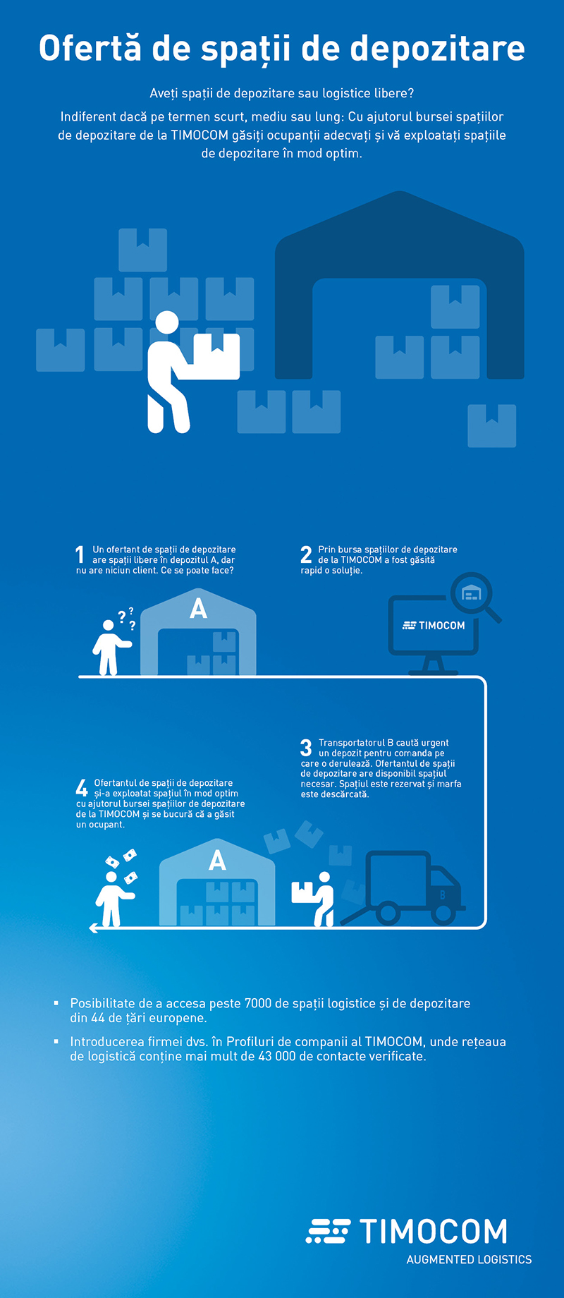 Aveți un depozit și doriți să-l exploatați în mod optim sau căutați un spațiu de depozitare adecvat? În acest caz, avem soluția pentru dumneavoastră: în cadrul TIMOCOM Marketplace oferim și o bursă a depozitelor. Aceasta este pe departe cea mai mare rețea B2B de spații de depozitare diverse din Europa – fără costuri suplimentare. Ca utilizator al sistemului, aveți acces automat la peste 9.000 de oferte de spații de depozitare și logistică din 46 de țări europene. În funcție de necesități, puteți primi sau publica oferte de spații de depozitare și contacta direct potențialii parteneri de afaceri.